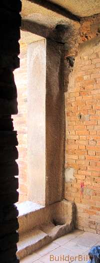 At the right is the inside of a temple doorway in Que Ngon in central Vietnam. The temple was built around a thousand years ago by people of the Champa civilisation. The door is long gone, but the socket holes for the hinges are still to be seen.